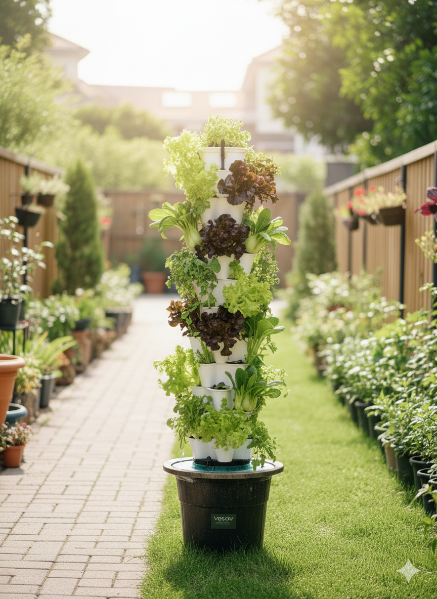 • Integrated Lighting and Irrigation: The towers come with integrated “VGroLights” and an auto-watering system. The lighting is specifically calibrated for optimal plant growth, and the self-watering system with a water level controller ensures plants are consistently fed.